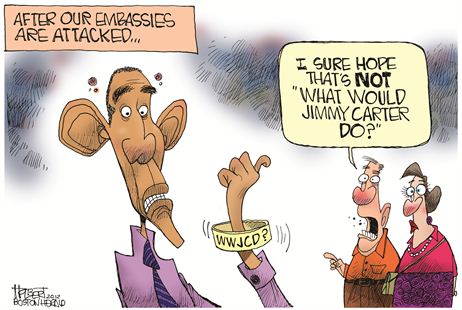 How was this Administration so completely blindsided by an orchestrated mob action across multiple Middle Eastern nations? Why have so many of its public statements, including what Barack Obama and Hillary Clinton said after they had plenty of time to process the events of Tuesday night, playing into the narrative that it's all a spontaneous outburst of rage against a "blasphemous" YouTube video? What about the Administration's rapidly deteriorating relationship with Israel? And why is the President politicking in Las Vegas – and making explicit use of the crisis to score political points – even as embassy attacks spread out to Yemen, and perhaps beyond?