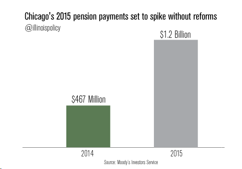 However, Chicago's burgeoning liability is not the city's only problem.  The yearly bill to pay for those pensions is set to spike 2.5 times to $1.2 billion in 2015 from $467 million in 2014...