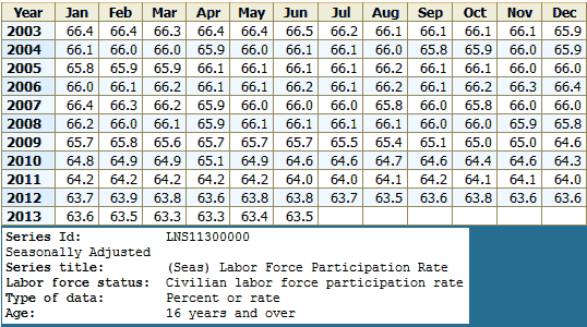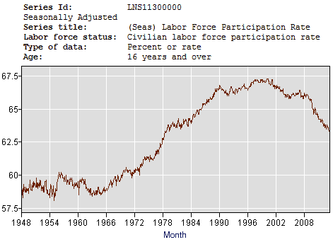 8. The Labor Force Participation Rate -- the percentage of eligible workers who actually have a job -- has stubbornly remained under 64 percent since 2011.